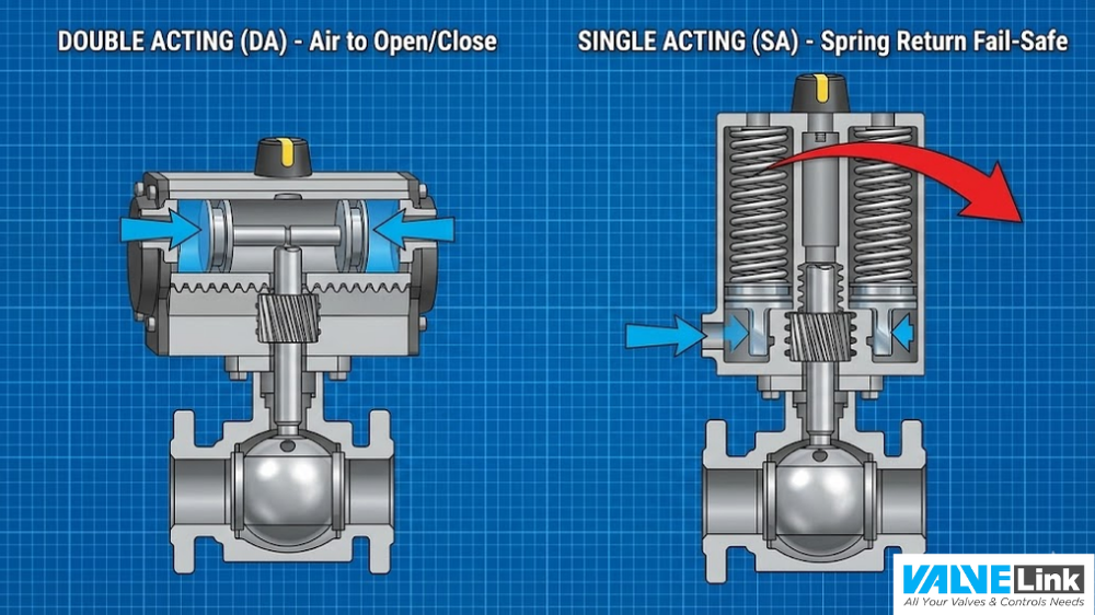 Một trong những thông số đầu tiên và quan trọng nhất cần xác định là: Bộ truyền động Tác Động Đơn (Single Acting – SA/Spring Return) hay Tác Động Kép (Double Acting – DA)?