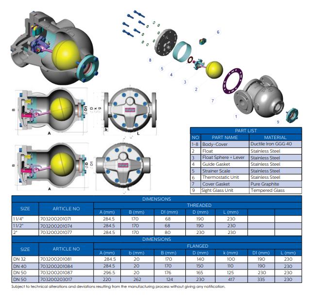 Thông số kỹ thuật Bẫy hơi cơ học Ayvaz Model SK-55