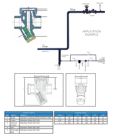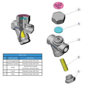 Các bộ phận chống rò rỉ của bẫy hơi nhiệt động Ayvaz Model TDK-71 được làm bằng thép không gỉ và thân được làm bằng thép rèn C22,8. Áp suất đầu ra không được vượt quá 80% áp suất ban đầu ở điều kiện vận hành. TDK-71 có thể hoạt động tự động tùy thuộc vào tải ngưng tụ.
