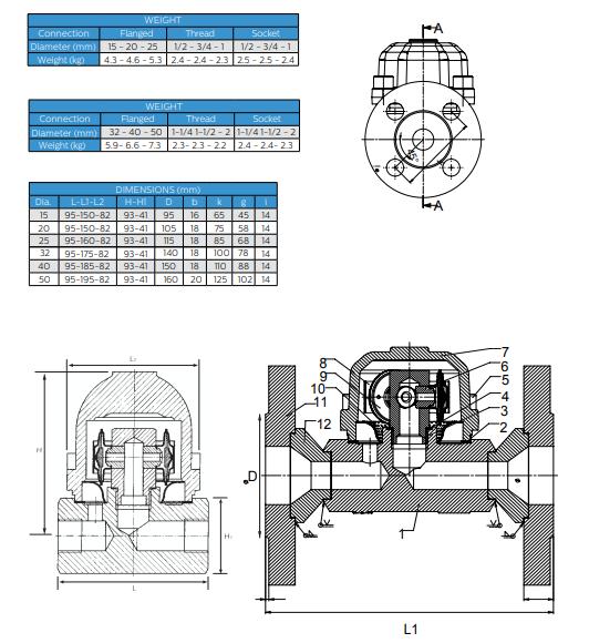 Thông số kỹ thuật Bẫy hơi nhiệt tĩnh Ayvaz Model TKK-3