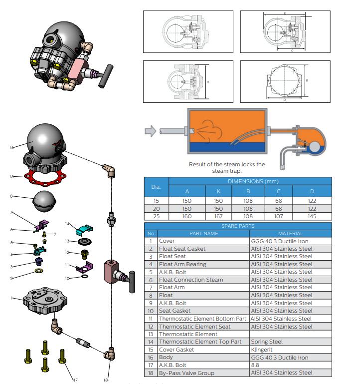 Khi hơi nước đến bẫy hơi trước nước ngưng, nó sẽ làm bẫy hơi bị khóa. Hơi nước được bỏ qua nhờ van kim trên Bẫy hơi phao Ayvaz Model SK-51 SLR, cho phép nước ngưng tụ thoát ra. Phao thực hiện nhiệm vụ thoát nước, còn viên nang nhiệt bên trong thân bẫy hơi thoát không khí.Điều này ngăn chặn hiện tượng búa nước do không khí trong đường ống. Nếu phao không hoạt động, viên nang nhiệt sẽ tiếp tục xả nước ngưng để ngăn hệ thống bị tắc.