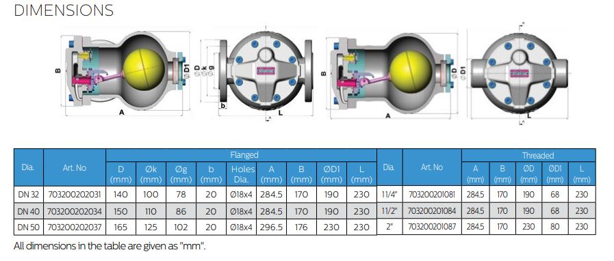 Thông số kỹ thuật Bẫy hơi phao Ayvaz Model SK-55LC