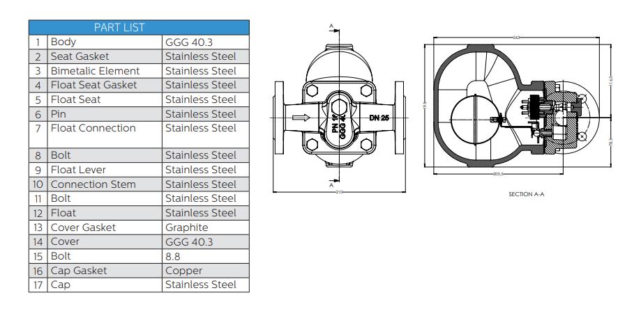 Thông số kỹ thuật Bẫy hơi phao lưỡng kim Ayvaz Model SK-50B