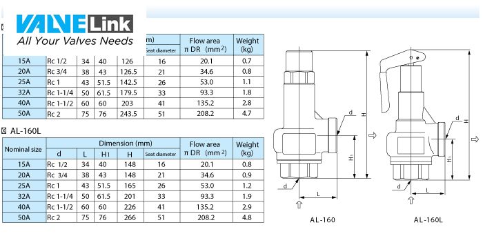 3. AL-160L là loại cần nâng và kiểm tra xả có thể được thực hiện thủ công trên van ở mức hơn 75% của áp suất mở.