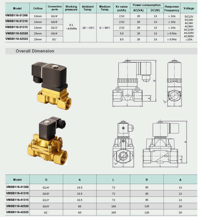 Series VMSB116-51308 đến 52525: Dải áp suất làm việc từ 0.1 – 4.0 MPa, chịu được nhiệt độ lưu chất từ 0°C đến 90°C.
