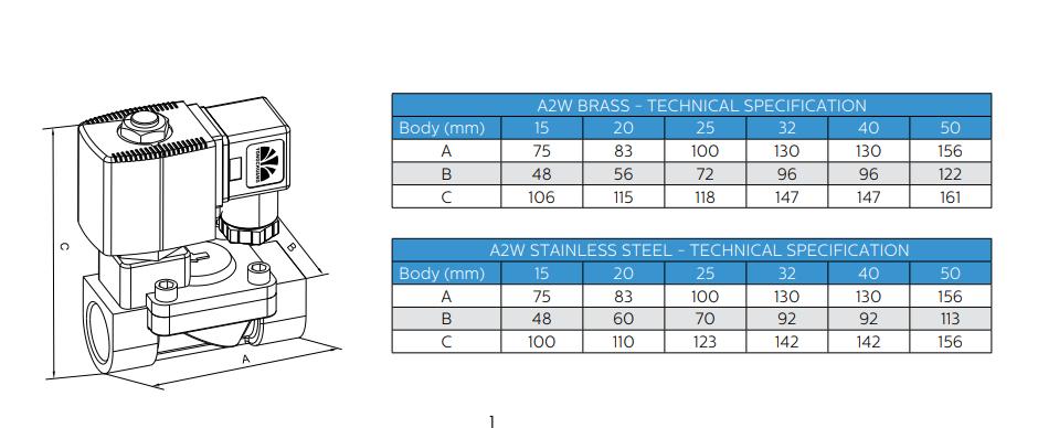 Thông số kỹ thuật Van điện từ Ayvaz Model A2W