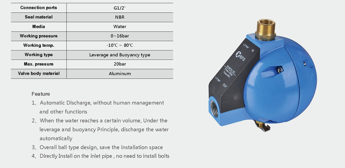 - Cơ chế xả tự động: Van hoạt động dựa trên nguyên lý đòn bẩy và lực đẩy Archimedes (buoyancy). Khi lượng nước tích tụ đạt đến một thể tích nhất định, lực đẩy của nước sẽ nâng phao, kích hoạt cơ cấu đòn bẩy để tự động xả nước ra ngoài.